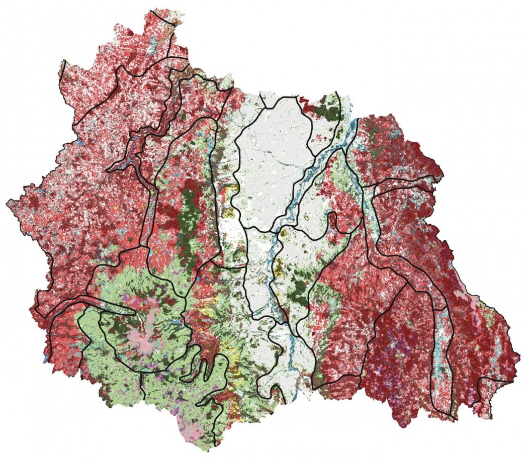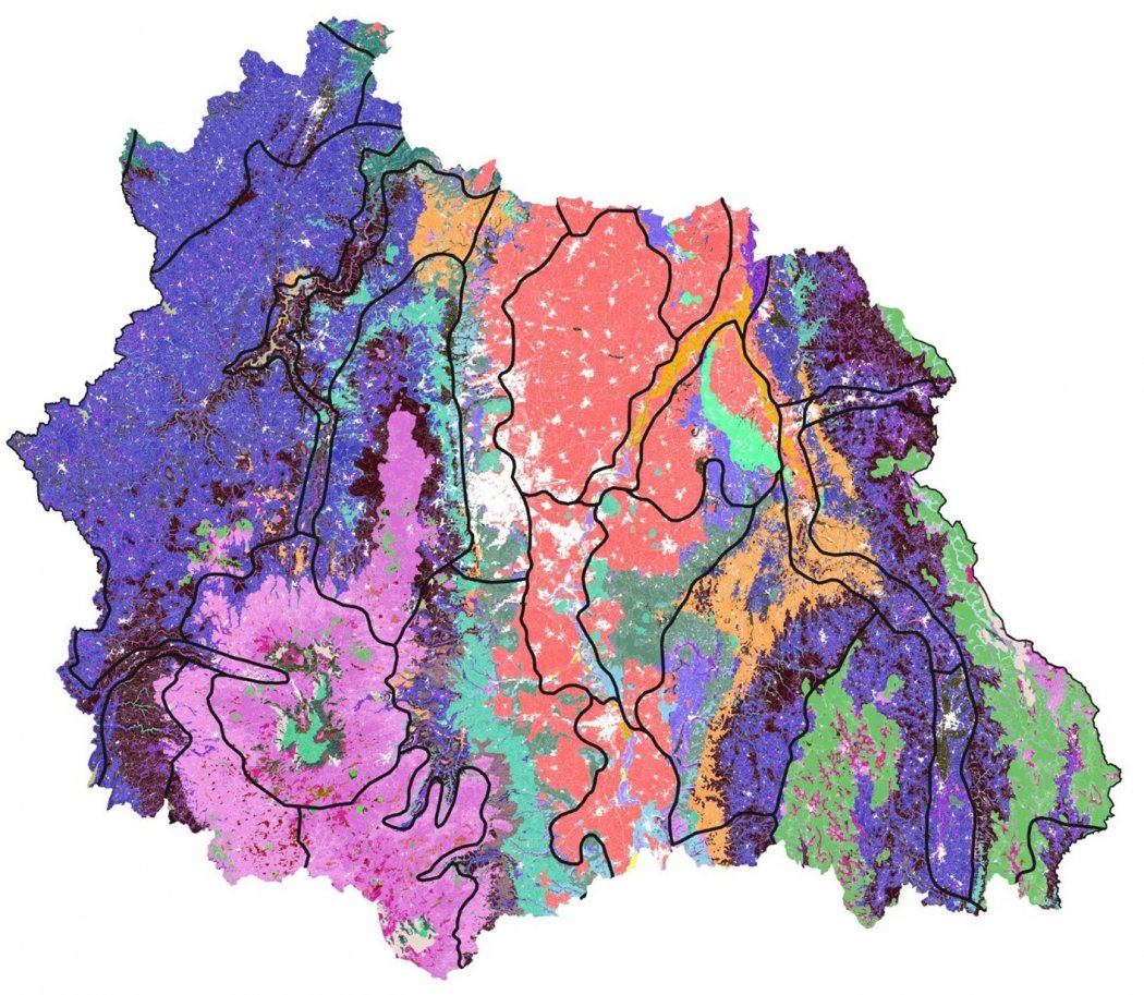 Par exemple, sur la carte des biotopes du département du Puy-de-Dôme, présentée ci-dessous, chaque tache de couleur correspond à une combinaison particulière des paramètres observés ; l’immense tache rose située au sud-ouest du département, autour du Sancy correspond ainsi aux territoires situés à l’étage montagnard sur sols neutres et frais, et soumis à un climat hyperhumide, en situation océanique. Cette carte des compartiments écologiques met en lumière l’extrême diversité du Puy-de-Dôme tant des points de vue climatique (très arrosé à l’ouest et sur les sommets, sec dans la Limagne), géologique (influence du volcanisme et du relief sur l’acidité du sol, zones sédimentaires, etc.), mais aussi certaines similitudes entre certains territoires : les biotopes observés sur les franges occidentales du département, par exemple, semblent similaires à celles observées sur les flancs occidentaux du Livradois et du Forez. Il est également intéressant de voir que les contours des petites régions naturelles (délimitées ici par des traits noirs), jusqu’alors délimitées à dire d’expert, épousent en grande partie les limites écologiques issues de ce travail de cartographie. Il est même permis de penser que ces contours pourraient être retravaillés ou affinés au regard de ces résultats, notamment sur la partie orientale du Puy-de-Dôme.