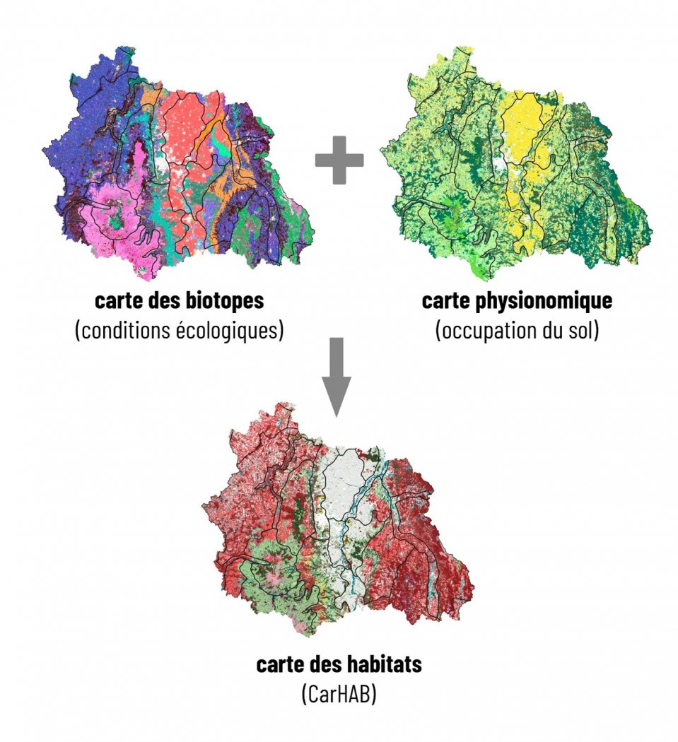 L’objectif du programme CarHab est de cumuler ces deux visions en une seule couche cartographique, représentant les habitats. À chaque tache de couleur correspond ainsi une physionomie et un biotope particuliers.