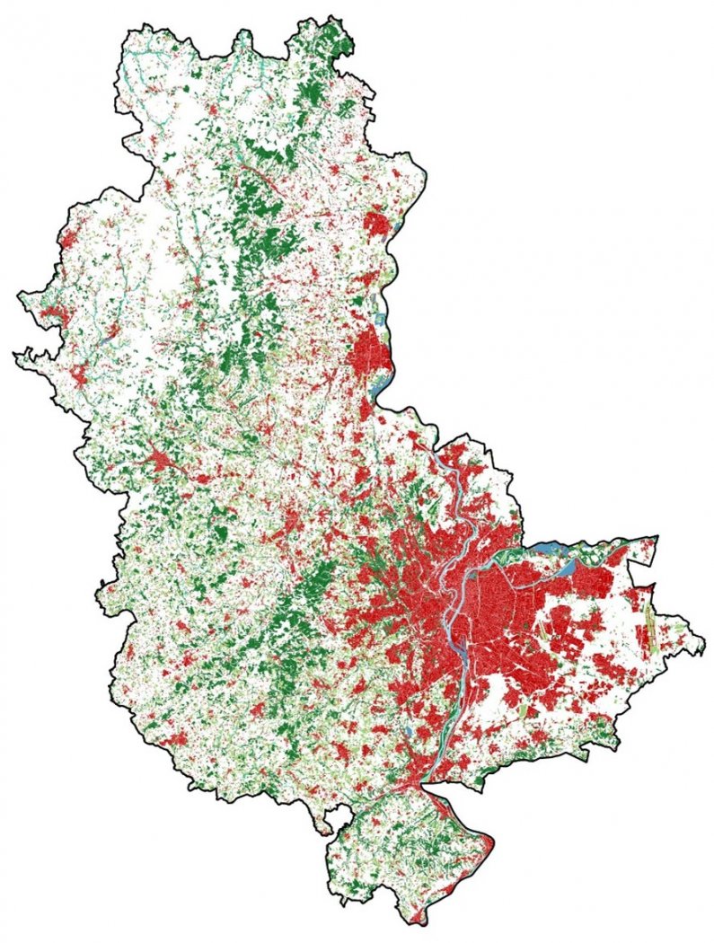 La cartographie suivante représente les habitats d’intérêt communautaire observés sur le département du Rhône (en vert), c’est-à-dire les habitats pour lesquels la France porte une responsabilité forte quant à leur préservation à l’échelle européenne. En croisant ces informations avec les zones urbaines et artificialisées révélées par la carte de la physionomie des végétations, il est possible de délimiter les zones de friction où de forts enjeux de conservation peuvent apparaître (forêts alluviales le long du Rhône, pelouses et bois thermophiles sur les monts d’Or et les monts du Lyonnais, etc.).