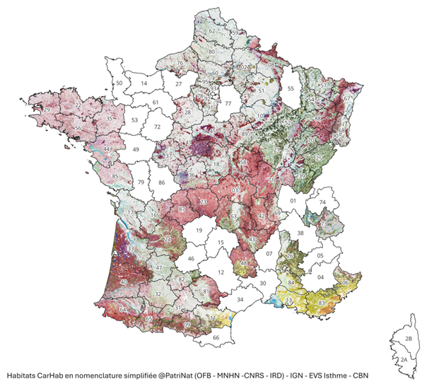 Grâce au développement de l'intelligence artificielle et notamment ses traitements algorithmiques, les cartographies départementales des habitats naturels et semi-naturels ont pu être progressivement mises à disposition sur le portail CarHab de l’INPN. Après les cartes de 44 départements mises à disposition en 2023 et 2024, celles de 26 départements supplémentaires ont été publiées en 2025. Une nouvelle région complète s'ajoute à la Bourgogne-Franche-Comté, le Centre-Val de Loire et les Hauts-de-France : la Bretagne. À ce jour, les trois quarts de la France métropolitaine font l’objet d’une modélisation cartographique des habitats naturels et semi-naturels.