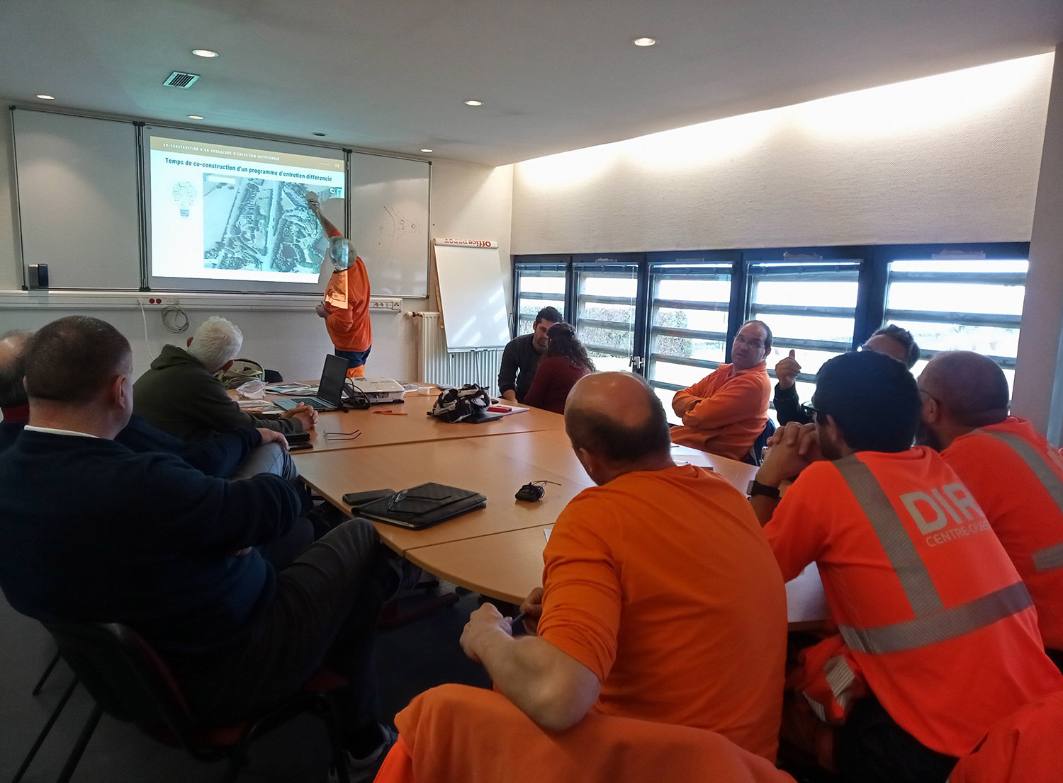 Plusieurs demi-journées ont été organisées dans les Centres d’entretien et d’intervention (CEI) de Feytiat, Uzerche, Etagnac, Bessines-sur-Gartempe, Guéret -, pour informer et sensibiliser les équipes sur les enjeux faune (démarche réalisée par la LPO Limousin) / flore mis en exergue (diversité observée, espèces patrimoniales et plantes exotiques envahissantes), faire le bilan des pratiques de gestion actuelles et dessiner les perspectives d’évolution de gestion en concertation avec les équipes. Les préconisations apportées ont été croisées avec celles faites en faveur d’autres groupes taxonomiques (pollinisateurs : étude Polli’routes réalisée en 2023 par les CPIE de la Corrèze et des Pays creusois ; accompagnement de la LPO, etc.). Ces préconisations ont pu porter sur l’adaptation des périodes et de la hauteur des fauches, la replantation de haies / confortement des trames existantes, la révision des cahiers des charges en cas de renouvellement des concessions sur le volet espaces verts, etc. Les temps d’échanges collectifs dans chaque CEI ont permis de dessiner et spatialiser de façon concertée les évolutions de pratiques d’entretien envisagées.