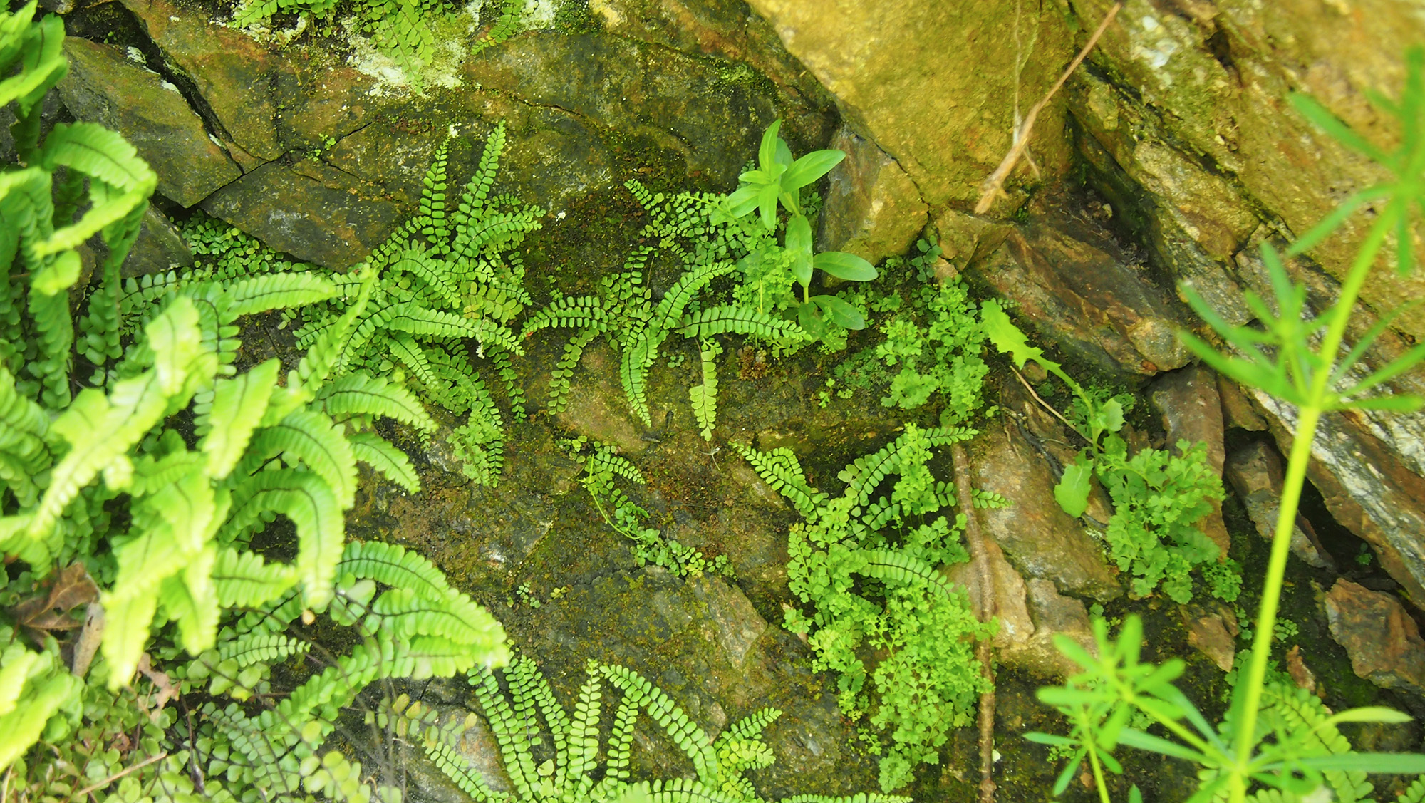 à droite, végétation des rochers et parois à Anogramme à feuilles grêles et Nombril-de-Vénus © N. MAILLET / CBNMC