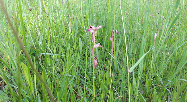 à droite, pelouse vivace à Orchis bouffon et Serapias langue © N. MAILLET / CBNMC